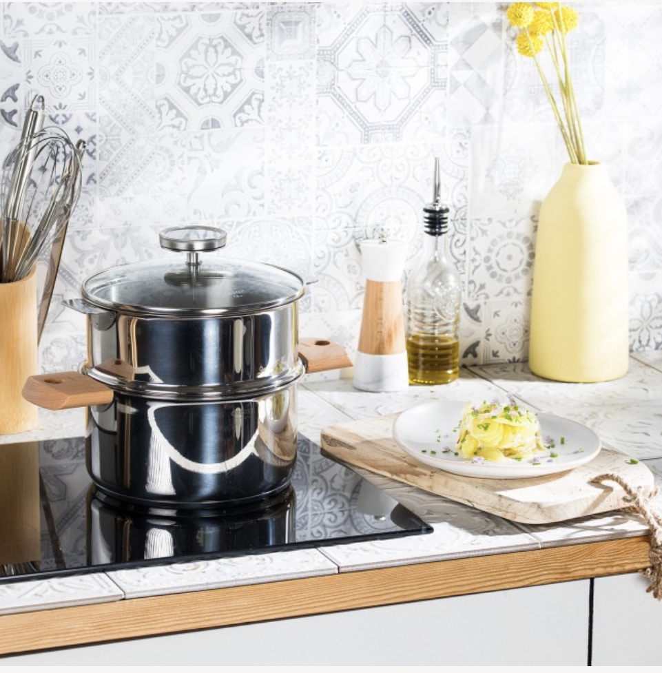 Biome is a cooker that combines three different cooking modes: gentle (below 90°C), steam (below 95°C) and a combination of the two. The thermometer combined with the ultra-resistant glass lid allows temperature control.