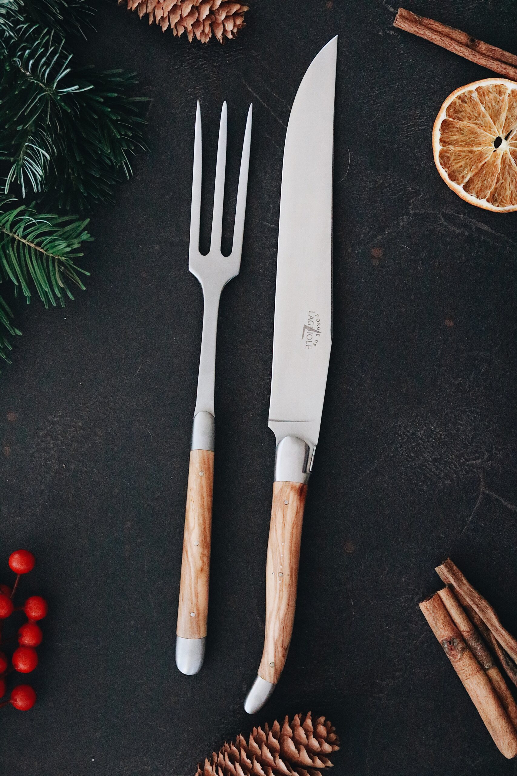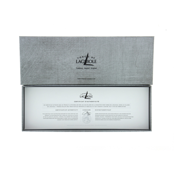 The knife (30 cm.) and fork carving set from Forge de Laguiole’s Art de la Table Tradition series is the perfect combination of traditional craftsmanship and a cultivated dining table. The Forge de Laguiole carving set is characterized by its impeccable and fluid cut. It refines the pleasure of cutting a piece of meat prepared with passion. The size of the knife indicated is its total length. To protect the handle in daily use, the knives are fitted with end bolsters. The so-called mitres are made of steel close off the handle. They are individually forged and attached to the drilled and polished plates.