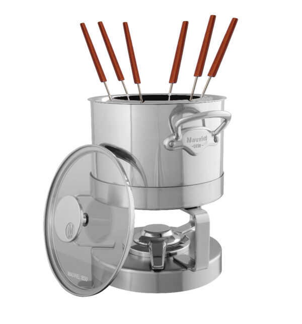 Fondue pot service with stainless steel frame and glass lid from M’Cook collection under the Service en Salle (Room Service) category. It comes with 6 stainless forks with wooden handles.