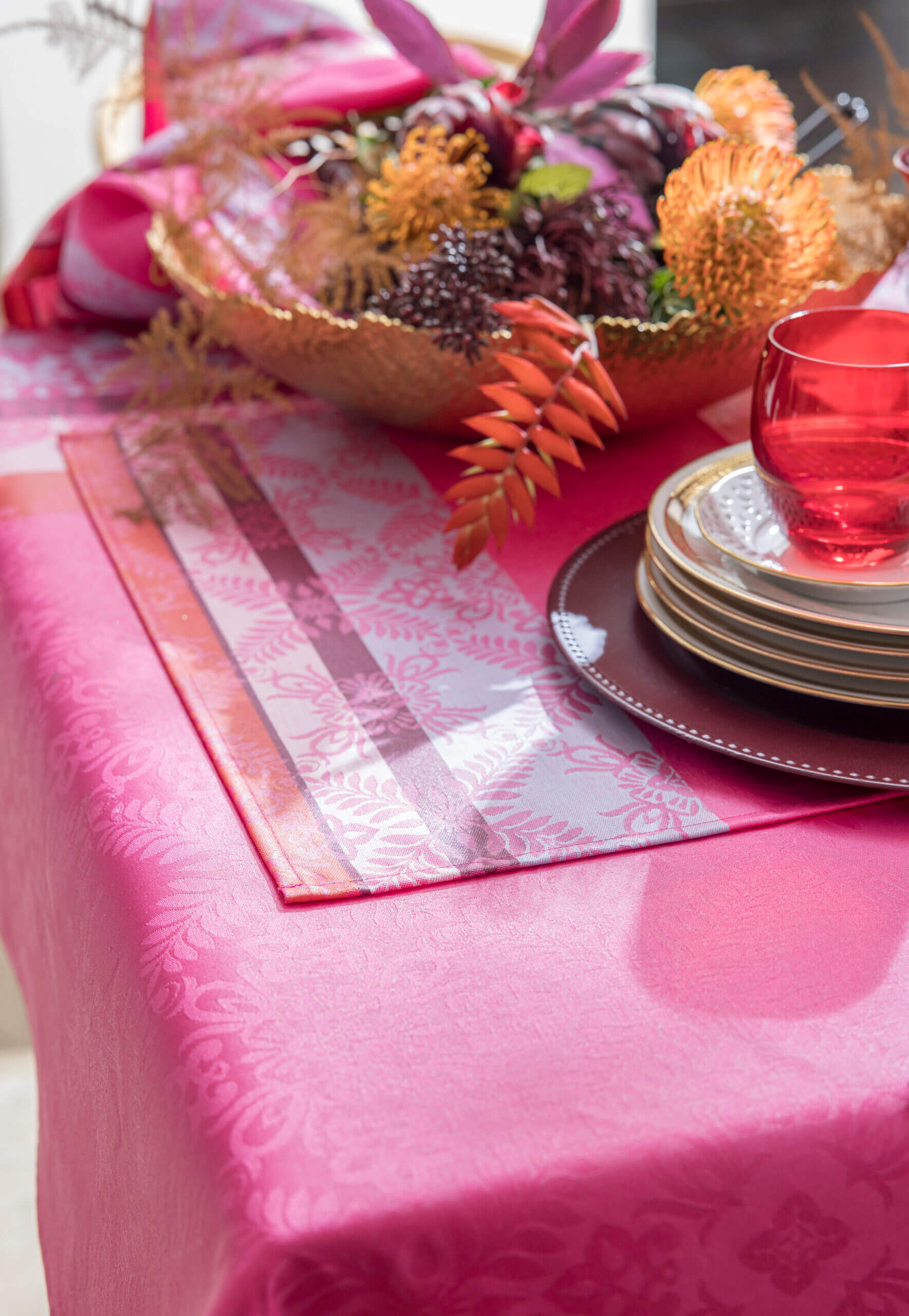 Vibrate to the rhythm of bold colors with the Mumbai collection by Le Jacquard Français. This season, let yourself be carried away to the heart of a reinvented India, where the ornaments of palaces unfold infinitely. Gourmet and spicy tables come to life with patterns such as pomegranates, pineapples, and lotus hearts, intertwined with lush foliage. The Mumbai collection harmoniously blends traditions, vibrant and enchanting colors, offering a striking sample of elegance and spirituality.