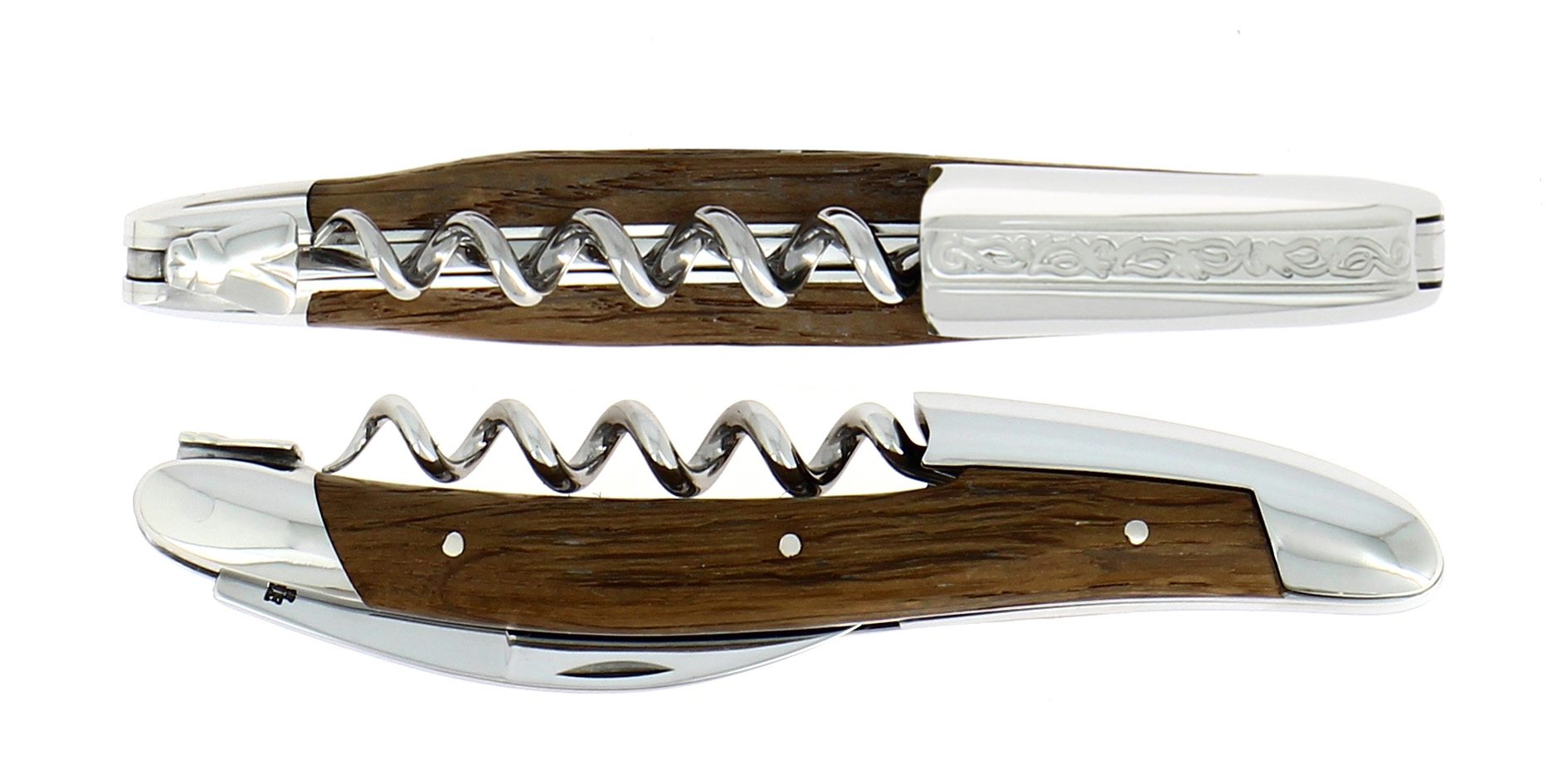 The Original Sommelier Knife by Forge de Laguiole was created in collaboration with professional sommeliers and thus gives it its ergonomics, elegance, and efficiency. The conical spiral, with 5 turns, of the corkscrew optimises its functionality, especially for the delicate corks of the finest vintage wines. The lever, whose operating principle is patented, is casted from heated metal and as a result is very resistant, hence can withstand intensive use. The blade of the knife is sharpened, allowing the capsule to be cut off cleanly and easily. The fossilized oak is dated 5,000 years old.
