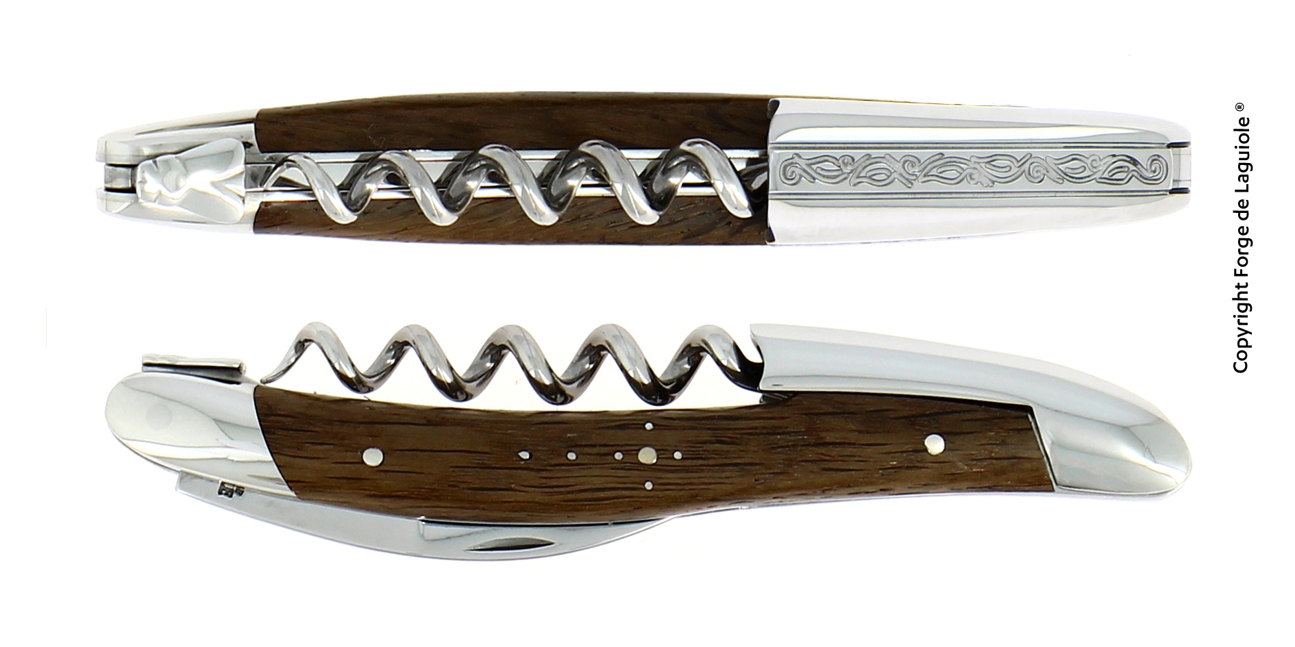 The Original Sommelier Knife by Forge de Laguiole was created in collaboration with professional sommeliers and thus gives it its ergonomics, elegance, and efficiency. The conical spiral, with 5 turns, of the corkscrew optimises its functionality, especially for the delicate corks of the finest vintage wines. The lever, whose operating principle is patented, is casted from heated metal and as a result is very resistant, hence can withstand intensive use. The blade of the knife is sharpened, allowing the capsule to be cut off cleanly and easily. The fossilized oak is dated 5,000 years old.